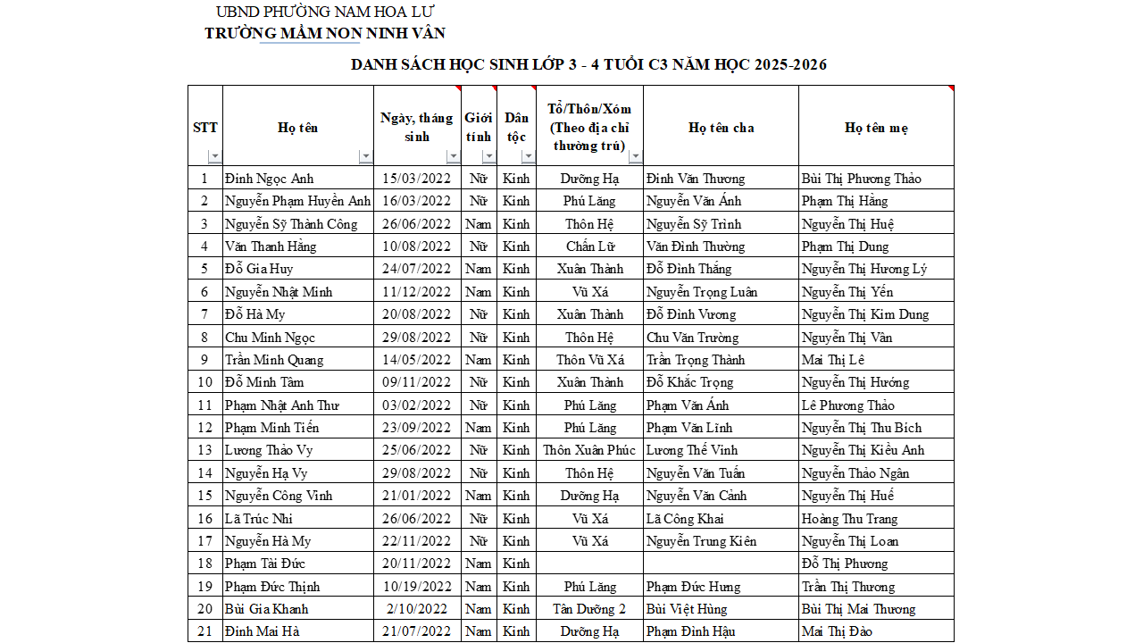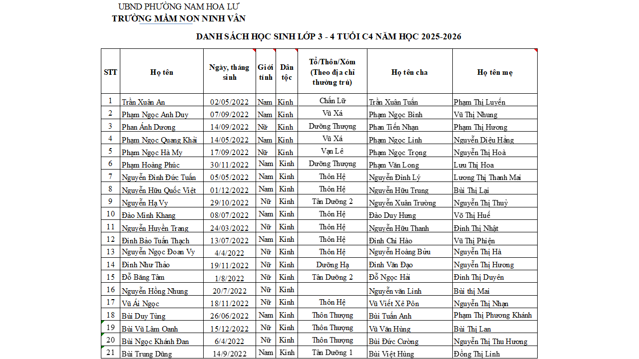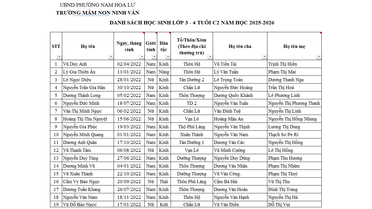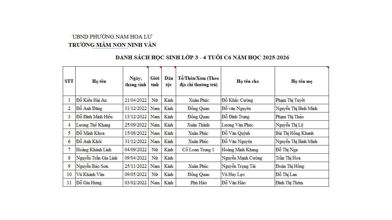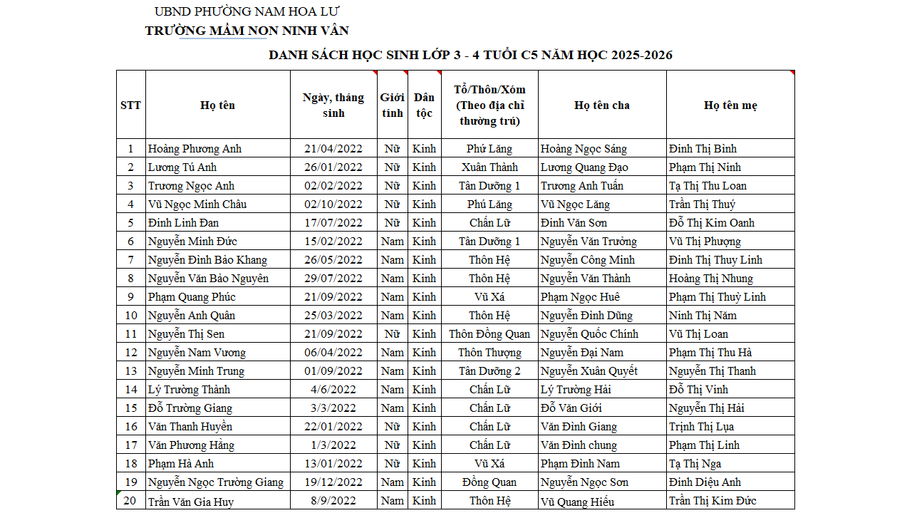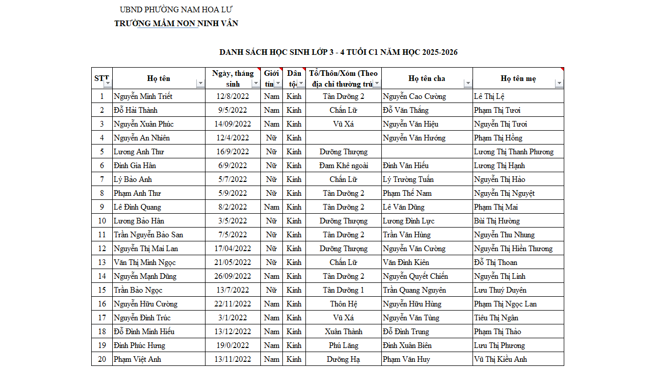Danh sách học sinh 3 tuổi theo lớp năm học 2025 – 2026