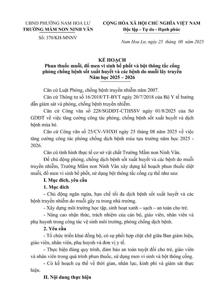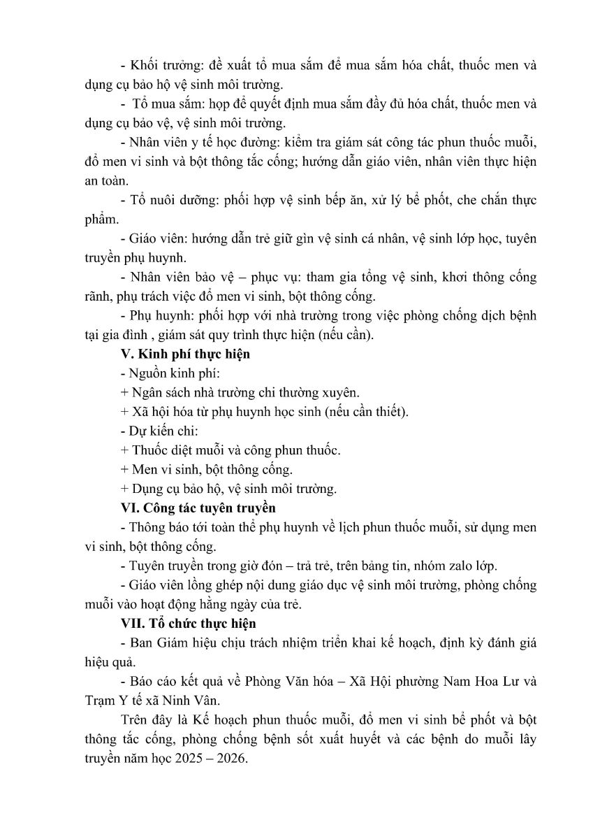 Kế hoạch phun thuốc muỗi, đổ men vi sinh bể phốt và bột thông tắc cống phòng chống bệnh sốt xuất huyết và các bệnh do muỗi lây truyền Năm học 2025 – 2026