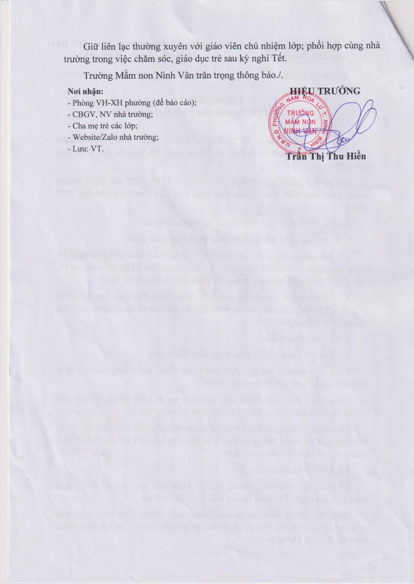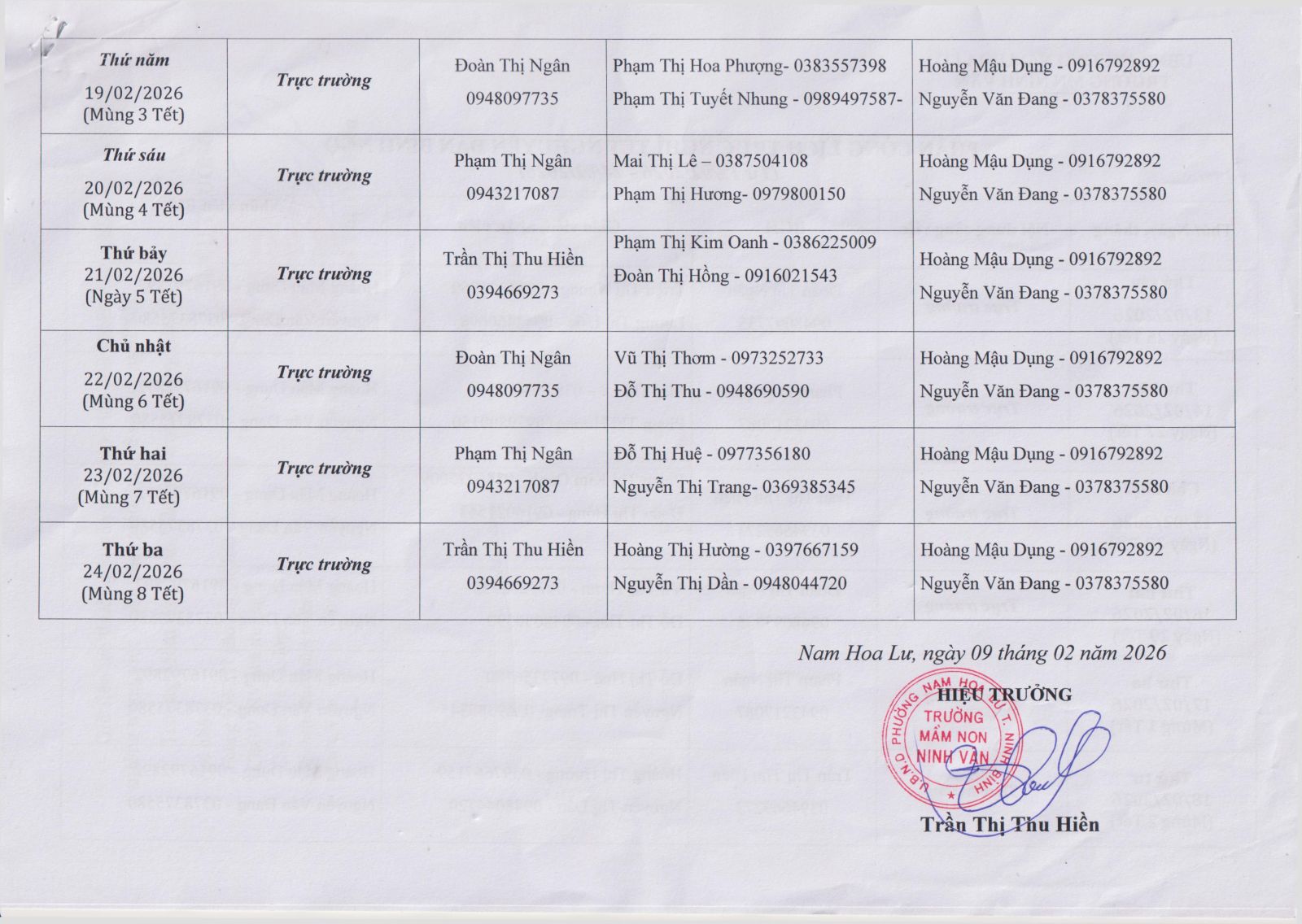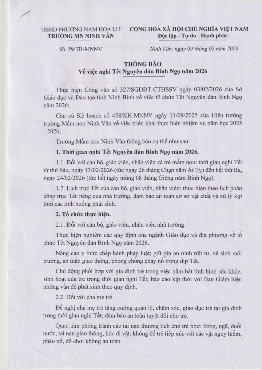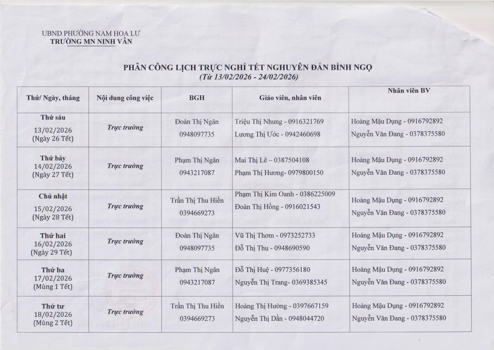 Lịch nghỉ Tết và trực Tết nguyên đán Bính Ngọ Năm 2026 của trường MN Ninh Vân