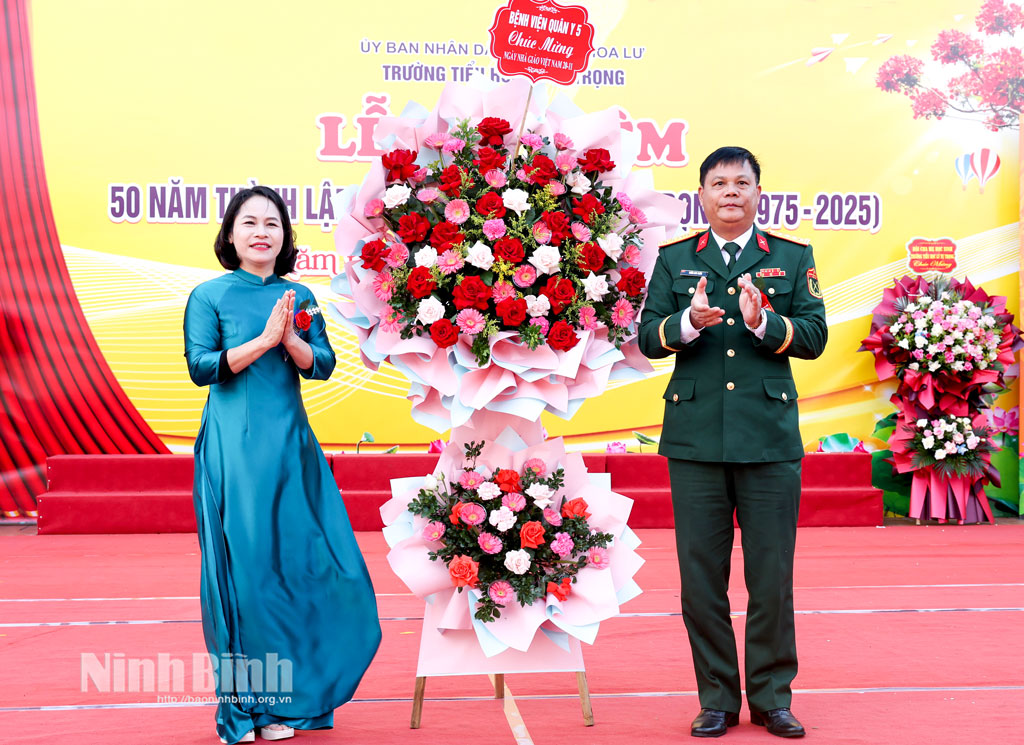 Lãnh đạo phường Hoa Lư tặng hoa chúc mừng Trường Mầm non Thanh Bình tại Lễ kỷ niệm 20 năm thành lập.