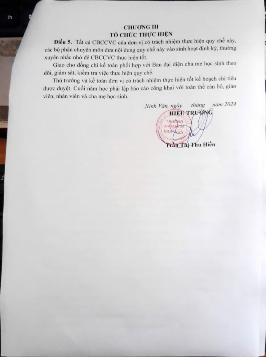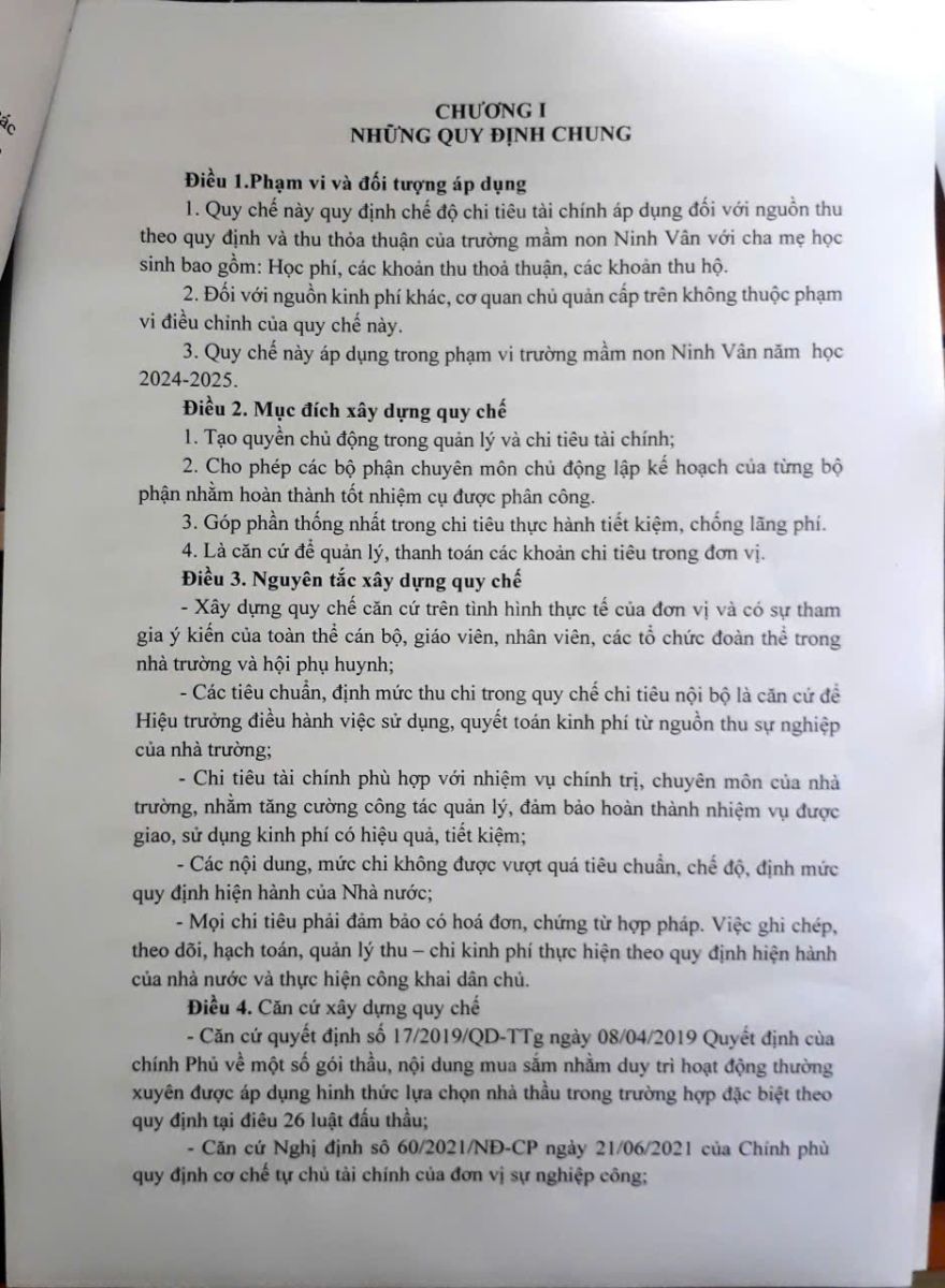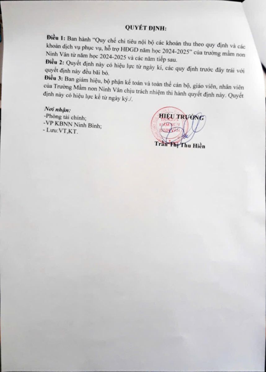 Quy chế chi tiêu nội bộ các khoản thu theo quy định, các khoản thu khác, các khaonr thu dịch vụ, phục vụ hỗ trợ hoạt động giáo dục trường Mầm non Ninh Vân năm học 2025 – 2026