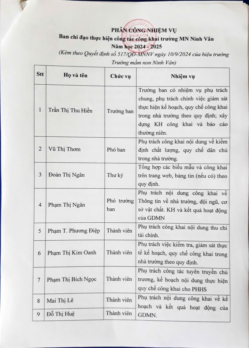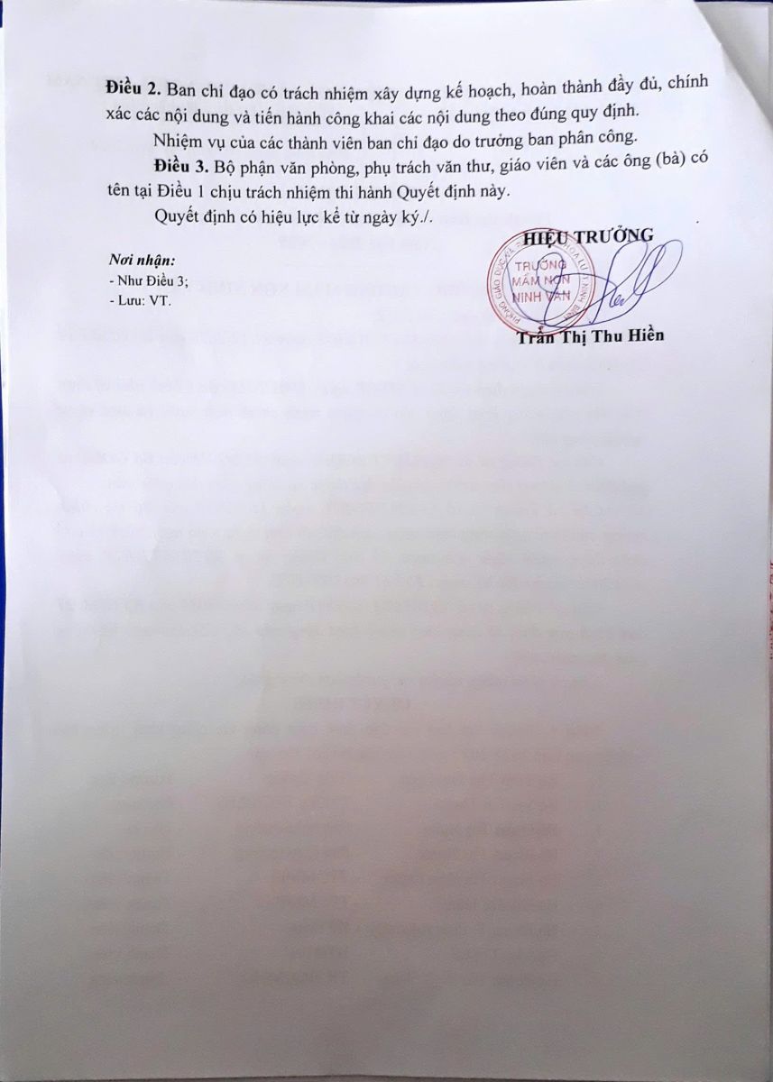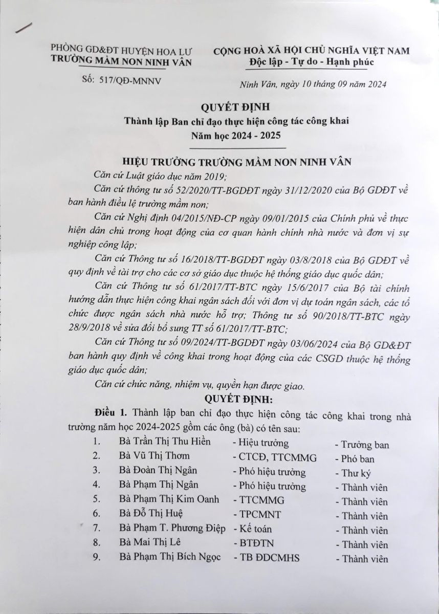 Quyết định thành lập ban chỉ đạo công tác công khai năm học 2024 – 2025
