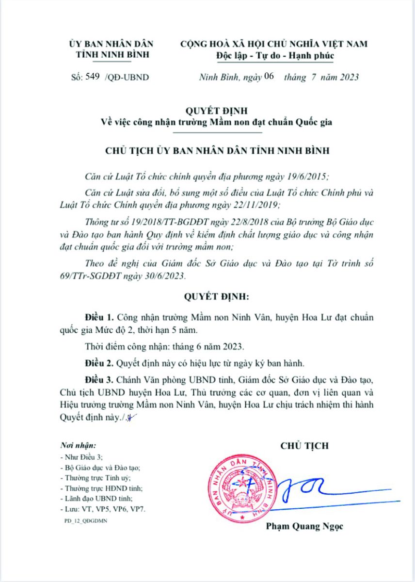 Quyết định về việc trường Mầm non Ninh Vân đạt chuẩn quốc gia mức độ 2 thời hạn năm năm bắt đầu từ tháng 06 năm 2023
