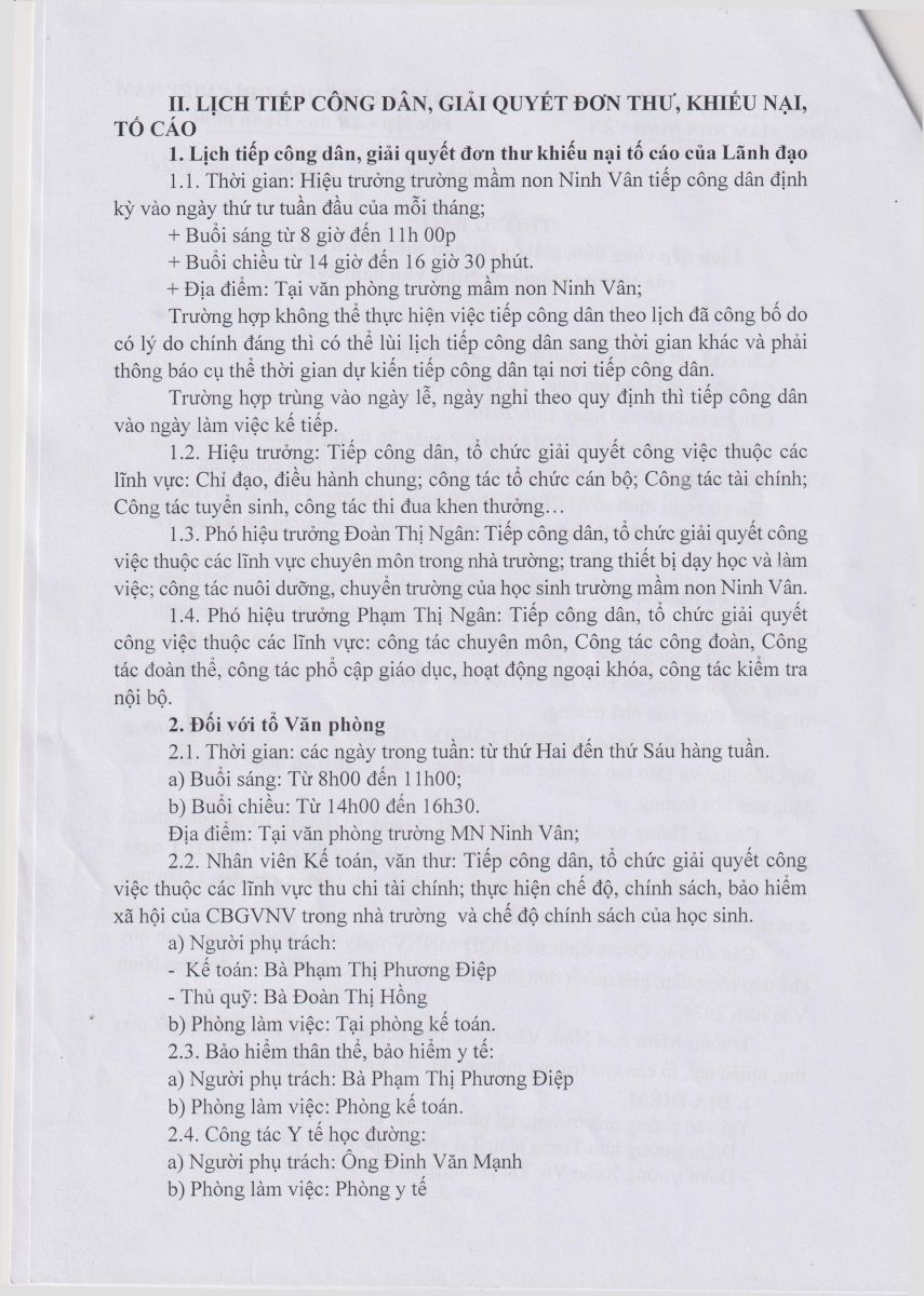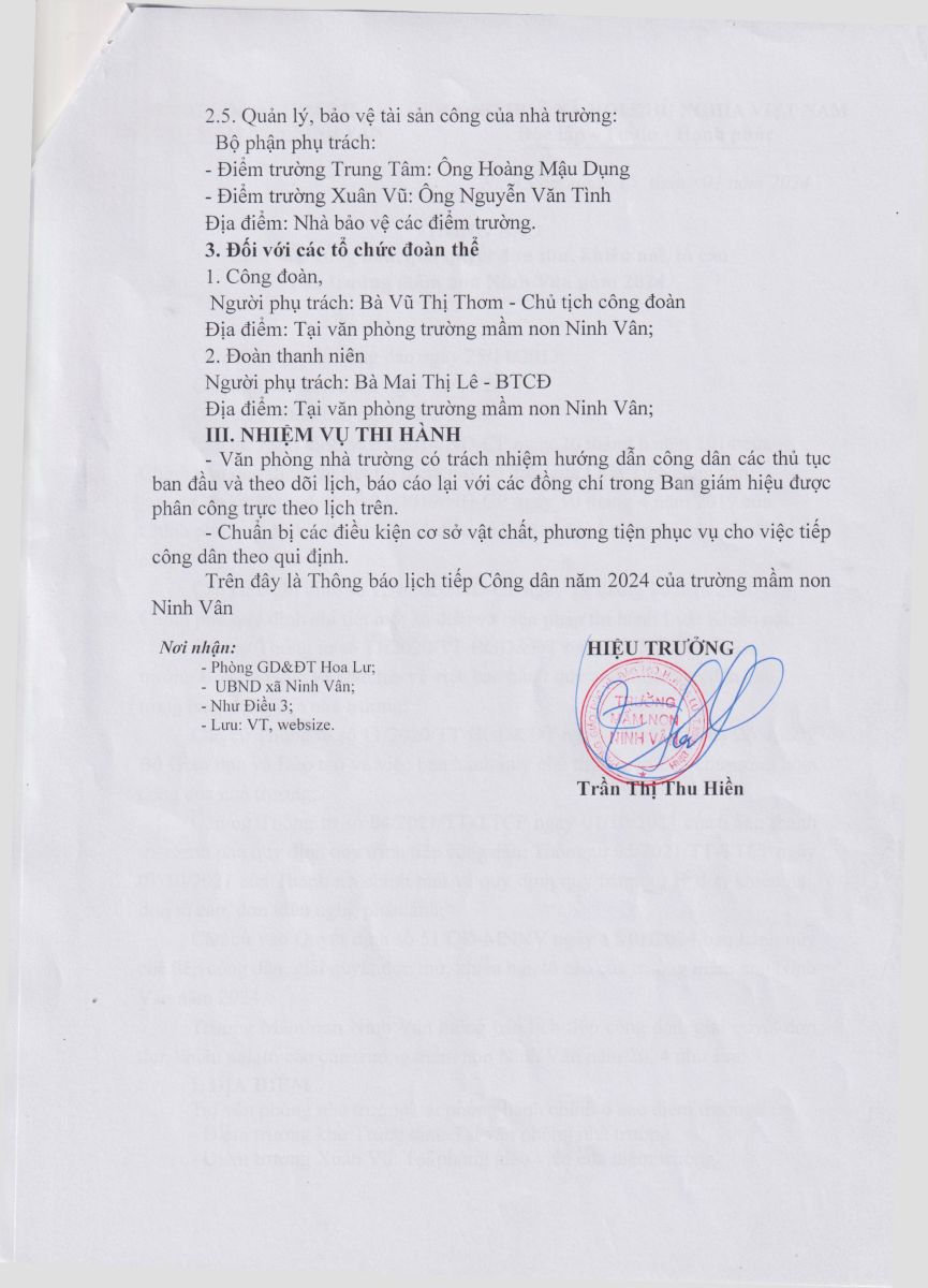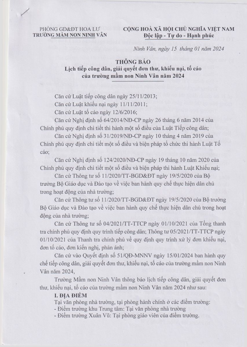 Thông báo lịch tiếp công dân, giải quyết đơn thư khiếu nại, tố cáo trường MN Ninh Vân năm 2024