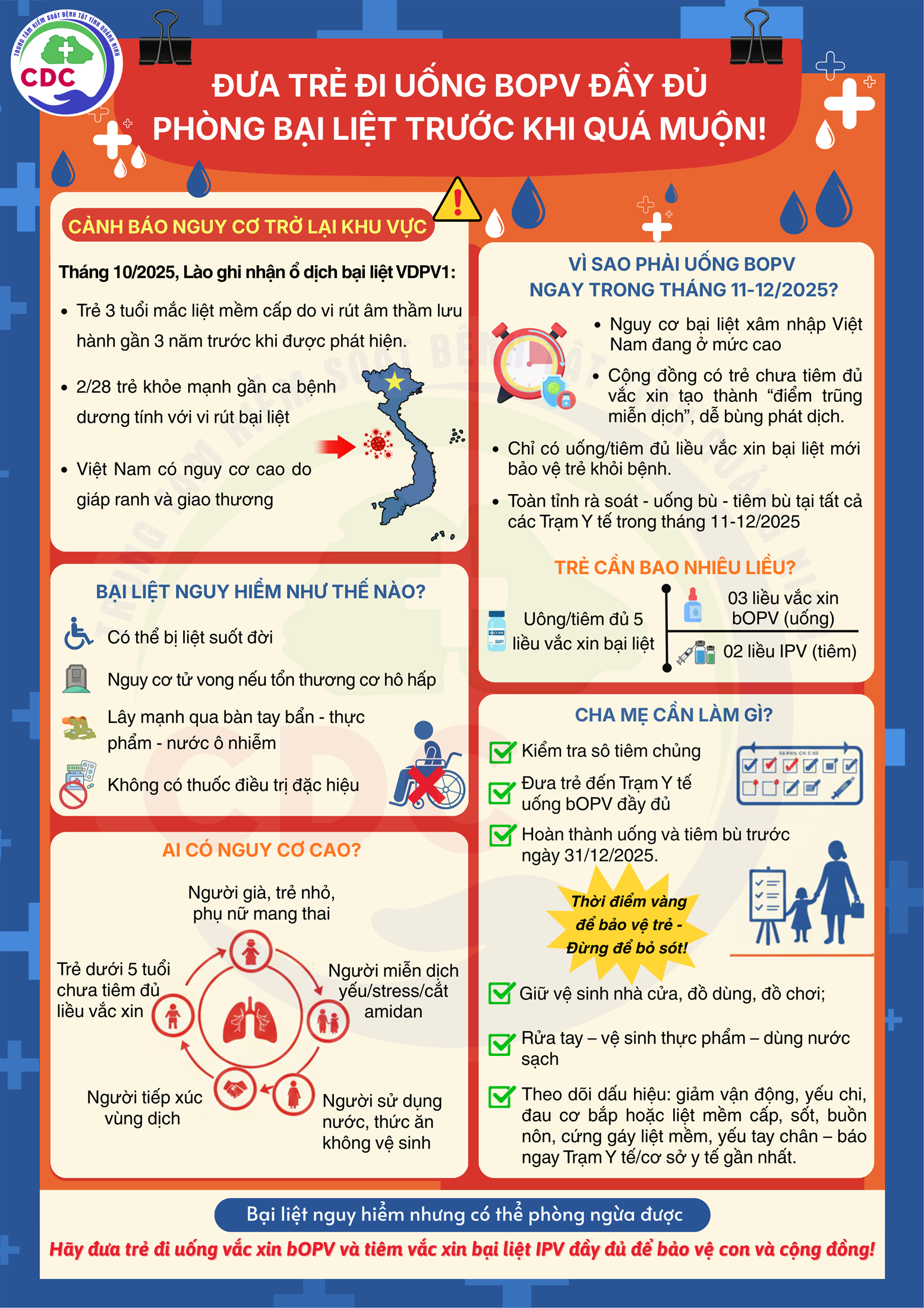 Bệnh bại liệt là bệnh truyền nhiễm nguy hiểm do vi rút Polio gây ra, lây truyền chủ yếu qua đường tiêu hóa, đặc biệt dễ lây nhiễm ở trẻ em. Bệnh có thể gây ra hội chứng liệt mềm cấp, để lại di chứng tàn tật suốt đời, thậm chí có thể dẫn đến tử vong nếu không được phát hiện và xử lý kịp thời.